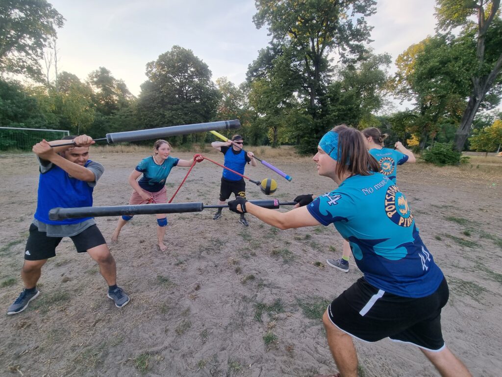 Wir sind die Potsdamer Piranhas, das zur Zeit einzige Juggerteam Potsdams. Wir betreiben Jugger nicht nur als Freizeitsport, sondern nehmen auch an Turnieren teil. Bei Jugger handelt es sich um einen spannenden, actiongeladenen Mannschaftsport, der weltweit immer mehr begeisterte Anhänger findet und bei dem es darum geht, den Spielball zu erobern und die gegnerische Mannschaft vom Ballträger fernzuhalten. Dazu werden mit Schaumstoff gepolsterte Sportgeräte, so genannte Pompfen, verwendet. Bei uns könnt ihr gerne ein Probetraining vereinbaren.